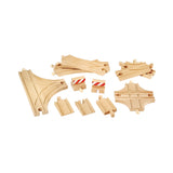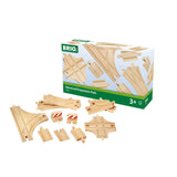 Expand the BRIO wooden railway system in all new directions with this multi functional pack of switches and accessories.