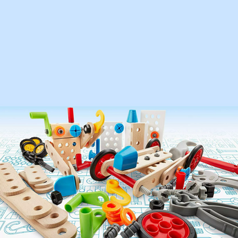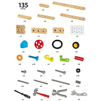 With these components and tools you can build almost anything your mind can design. A fun way to practice hand/eye coordination and creative idea construction. Includes building pieces including nuts, bolts, a hammer and a screwdriver.