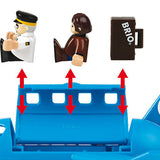 Ready for take-off! The three-seat airplane is now ready for boarding and new, great adventures lie ahead. Includes a blue airplane with a panel that opens to place the passengers, two poseable figures, a rolling stair cart and a suitcase.